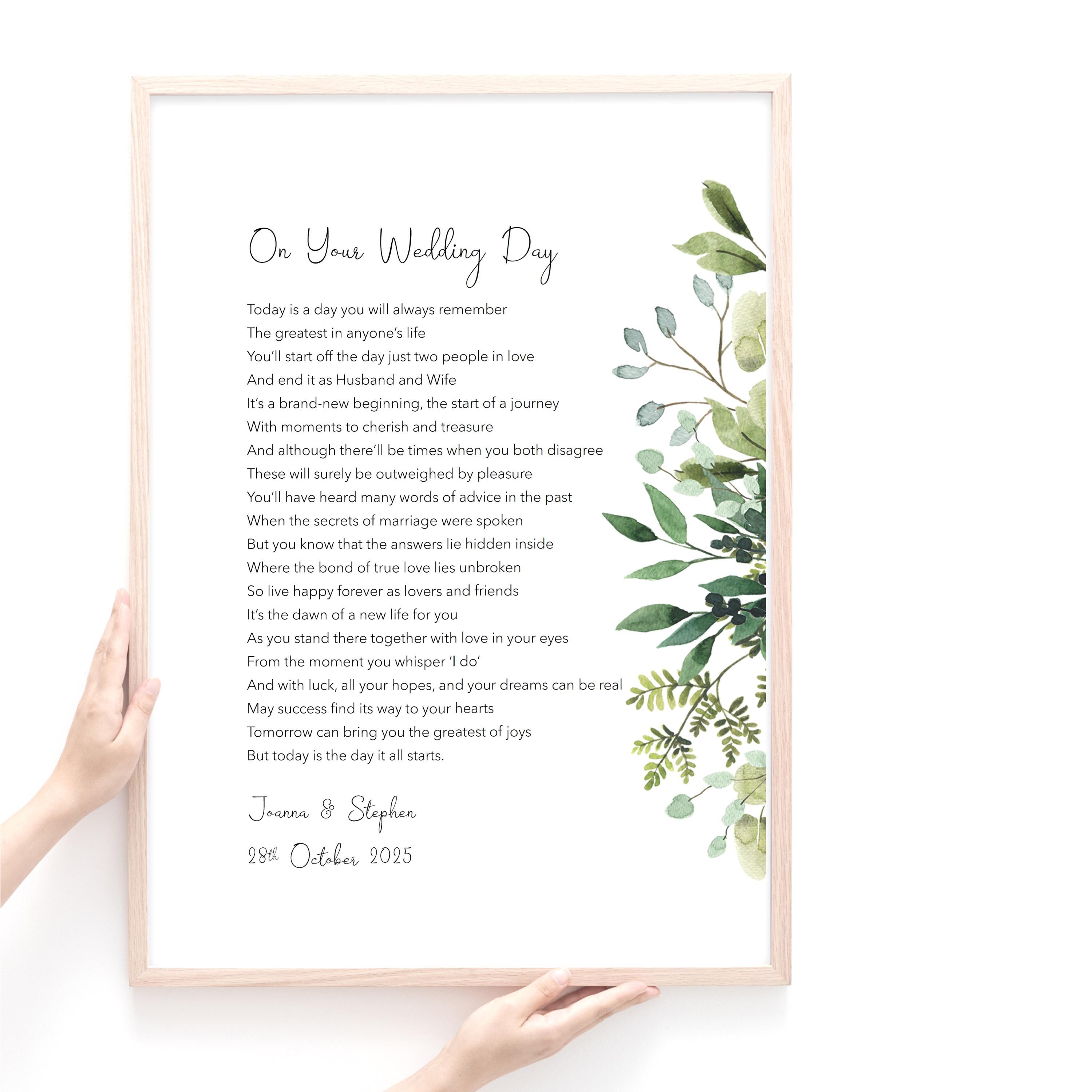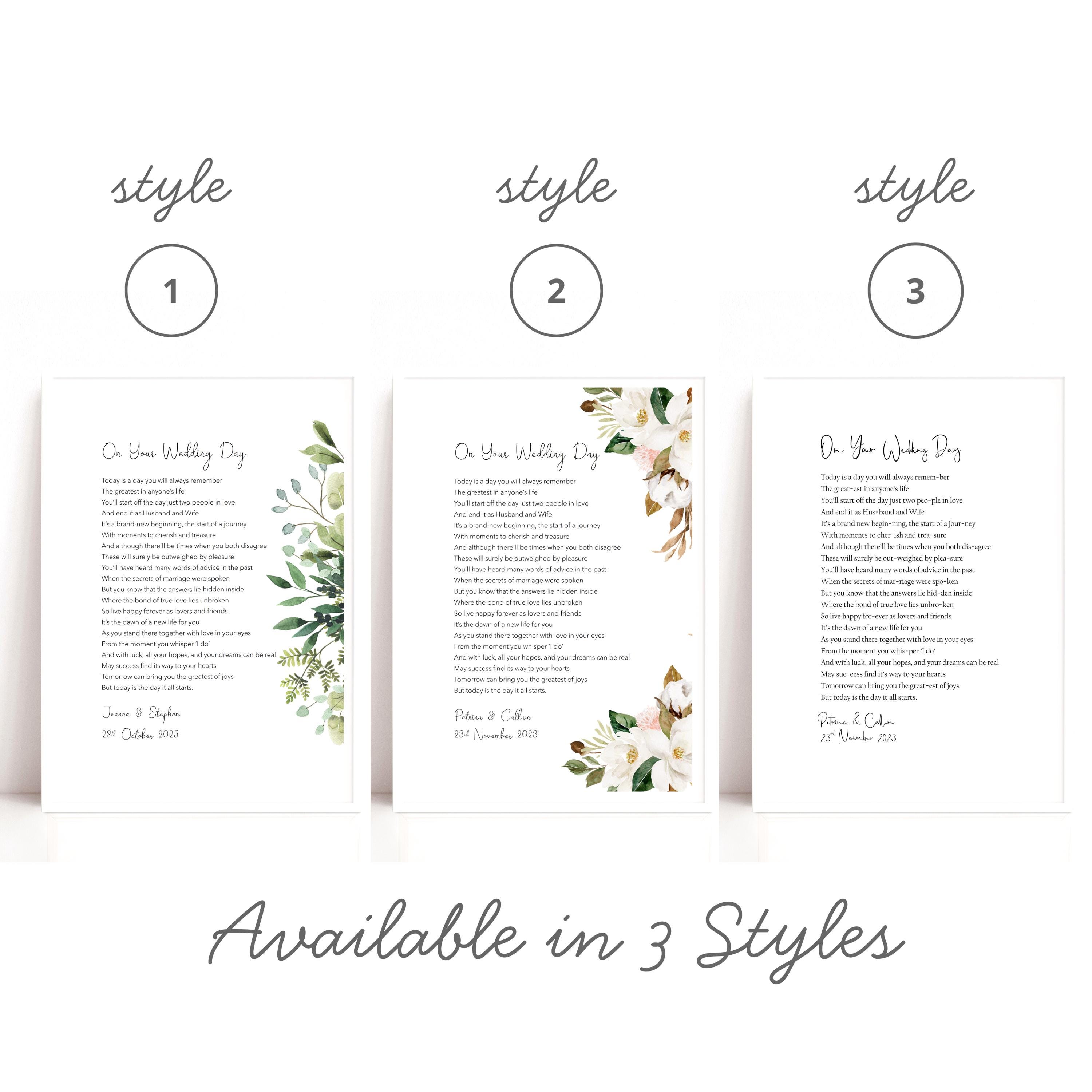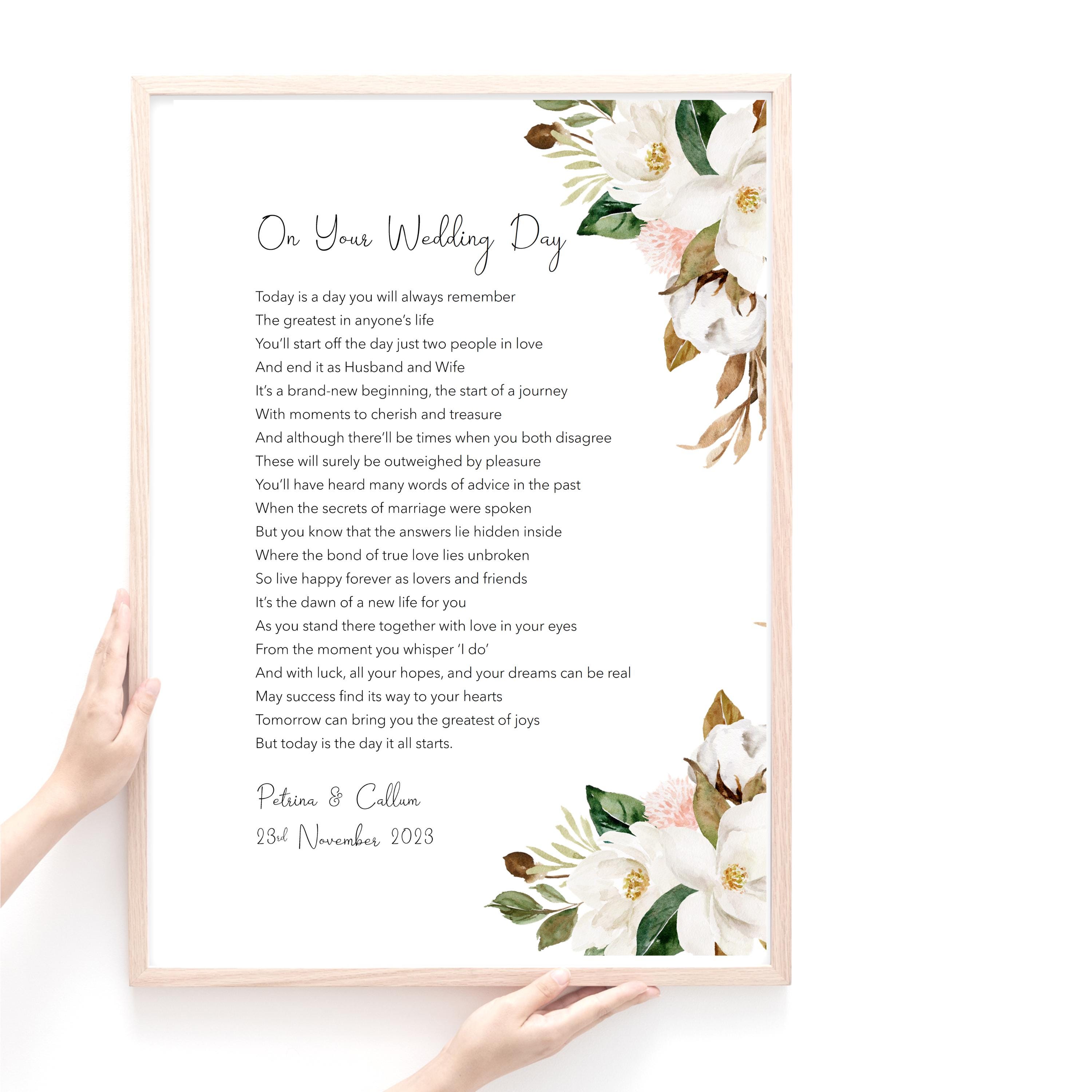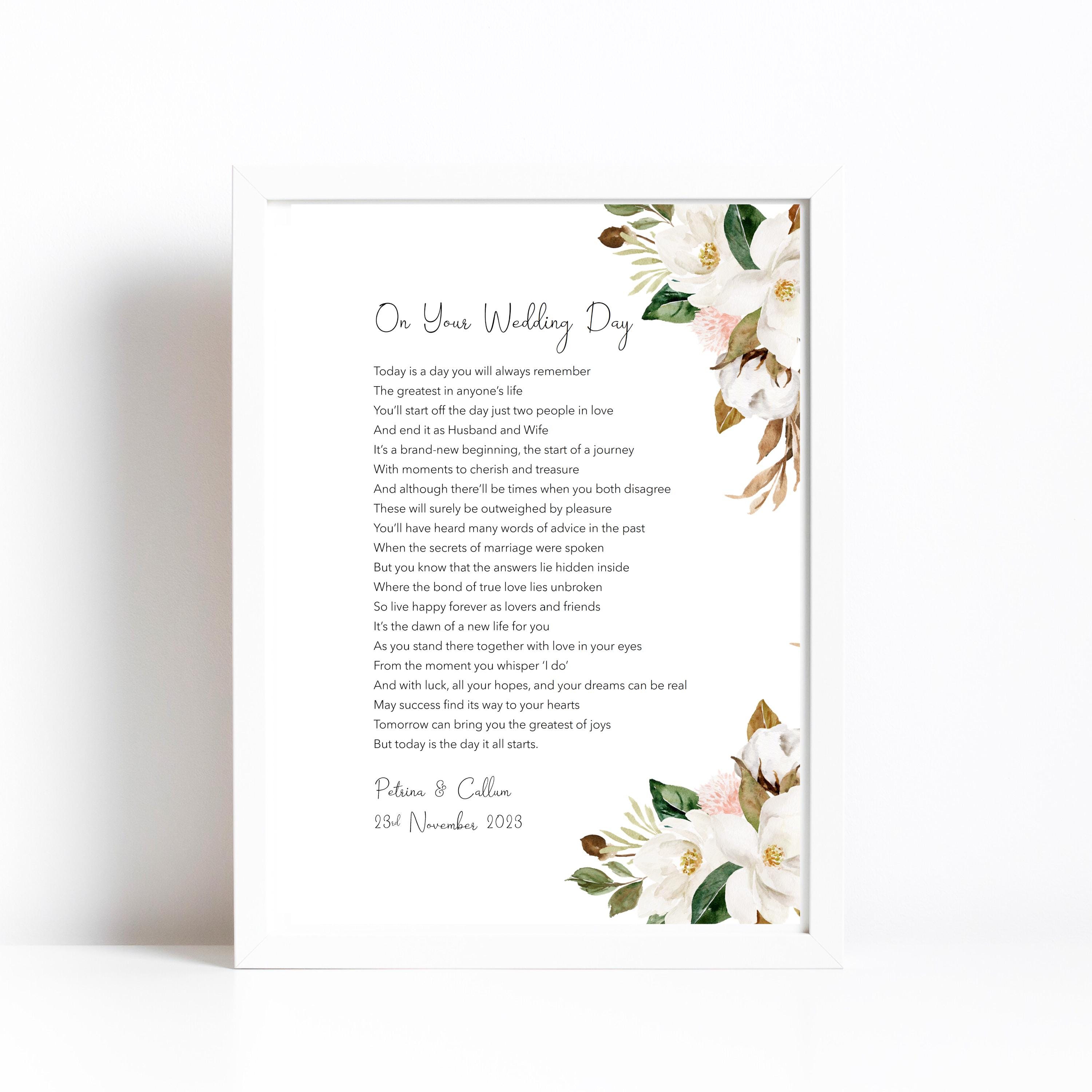 This wedding poem print can be personalised with any names and wedding date and has 3 different designs to choose from, one with green floral decal, one with cream magnolia flowers and one in a simple typography style without decoration.