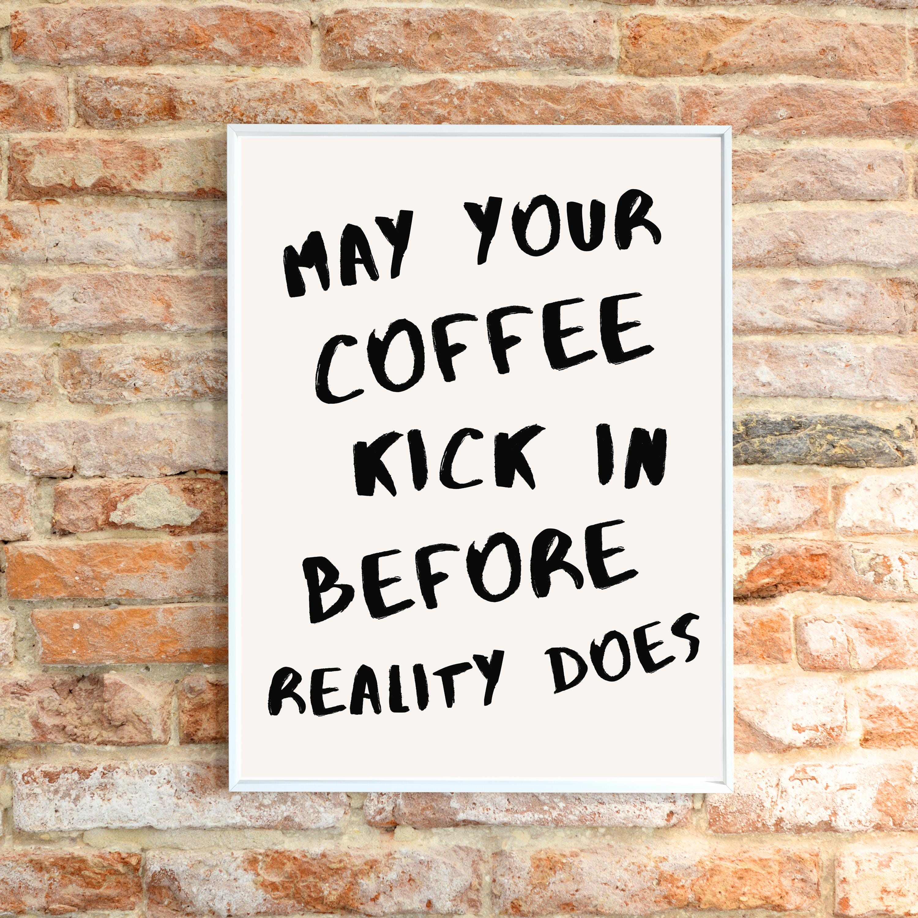 May Your Coffee Kick In Before Reality Does - This fun, bold typography print comes in black and cream and adds a playfulness to any kitchen or café wall. It comes in a range of sizes from small to large.